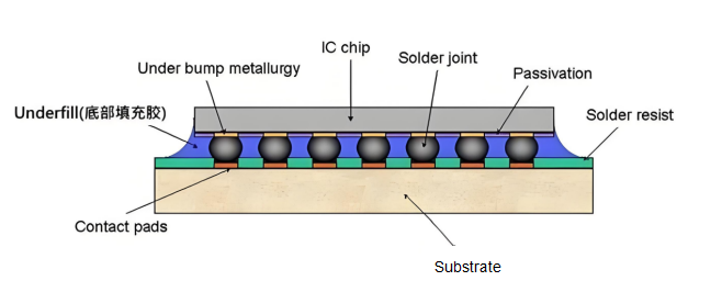Voids: Unfilled cavities within the underfill that may lead to thermal stress concentration or mechanical failure.